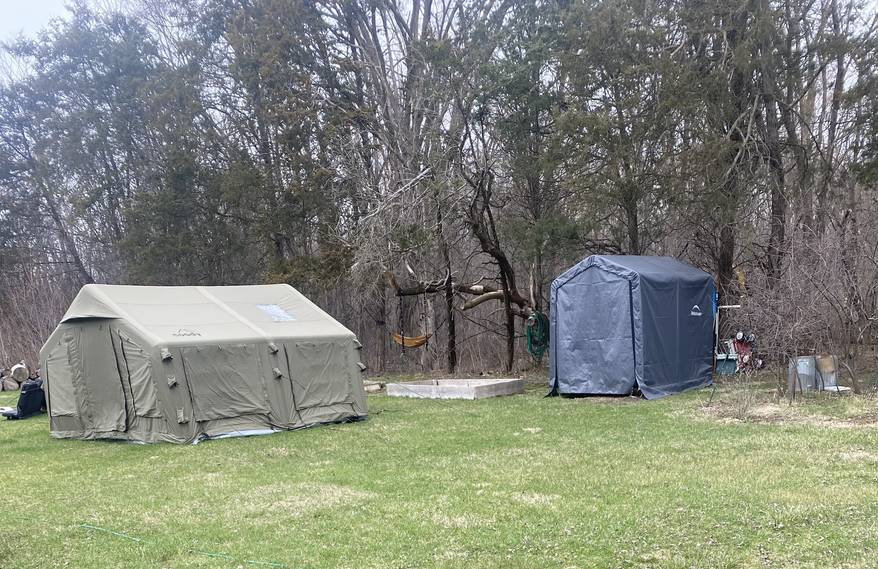 My partner set up both tents in his backyard. Our backyard, now that I live here. One tent is for us to hangout in, and one for the stray cats. The tent for us is a two-room canvas tent with two twin sized mattresses on top of each other and some furniture. The other tent is a floor-less shed-type tent with a bed for the cats in it.