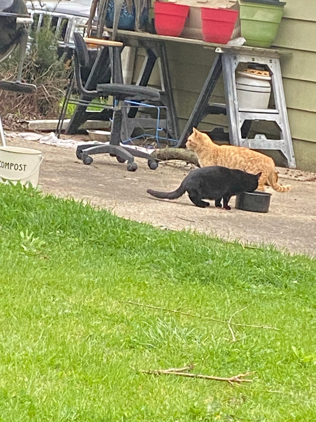 I feed the stray cats in my community. I’ve counted six stray cats in total. There are four cats that my partner has been feeding since they were kittens: two orange ones, a calico one, and a black one. Orangey 2 is friendly. Orangey 1 is fat. The calico one and the black one are still skittish, but we are slowly gaining their trust.