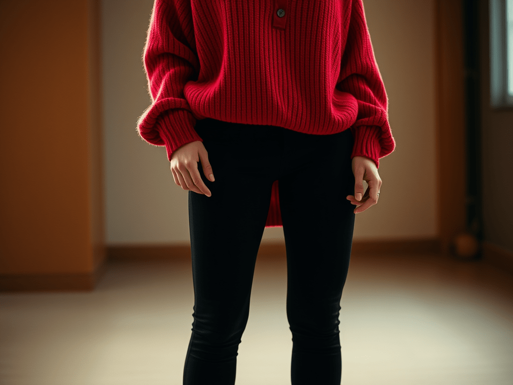 If I had to wear one outfit over and over again, I would choose black leggings. I would pair them with a red oversize sweater. Under the sweater, I would wear a collared back button-up shirt.