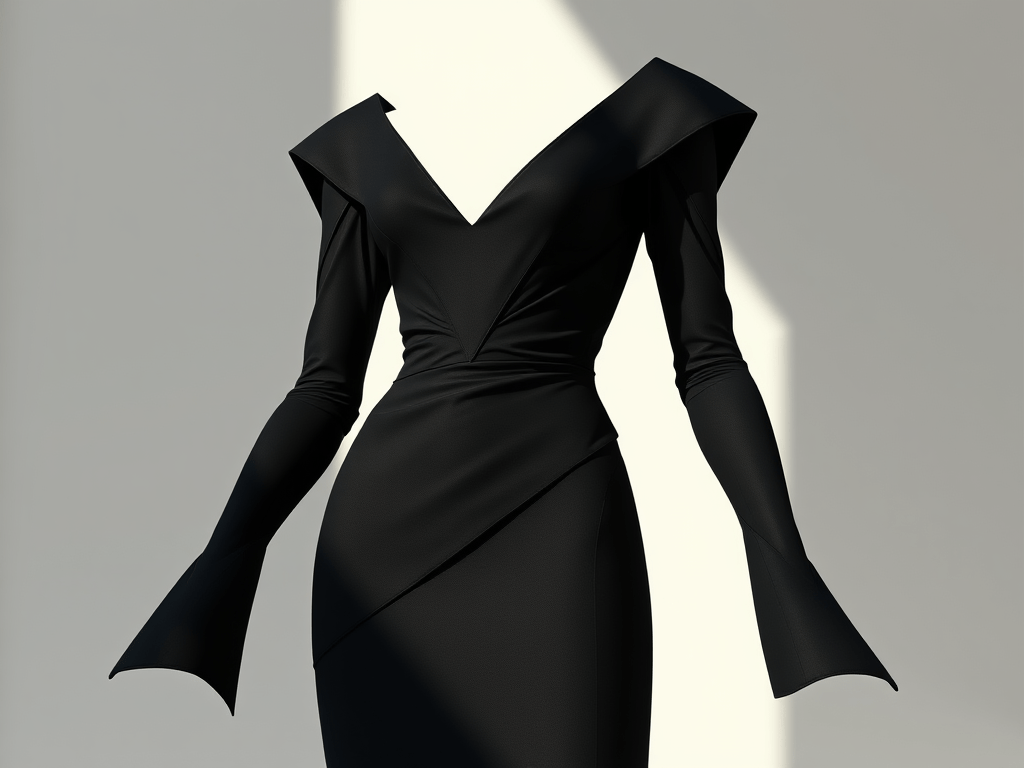 A black, structured dress with a triangle theme. The long sleeves would be diamond-shaped. The torso would be a triangle with two ends at the tips of the shoulders. It would be elegant and chic.