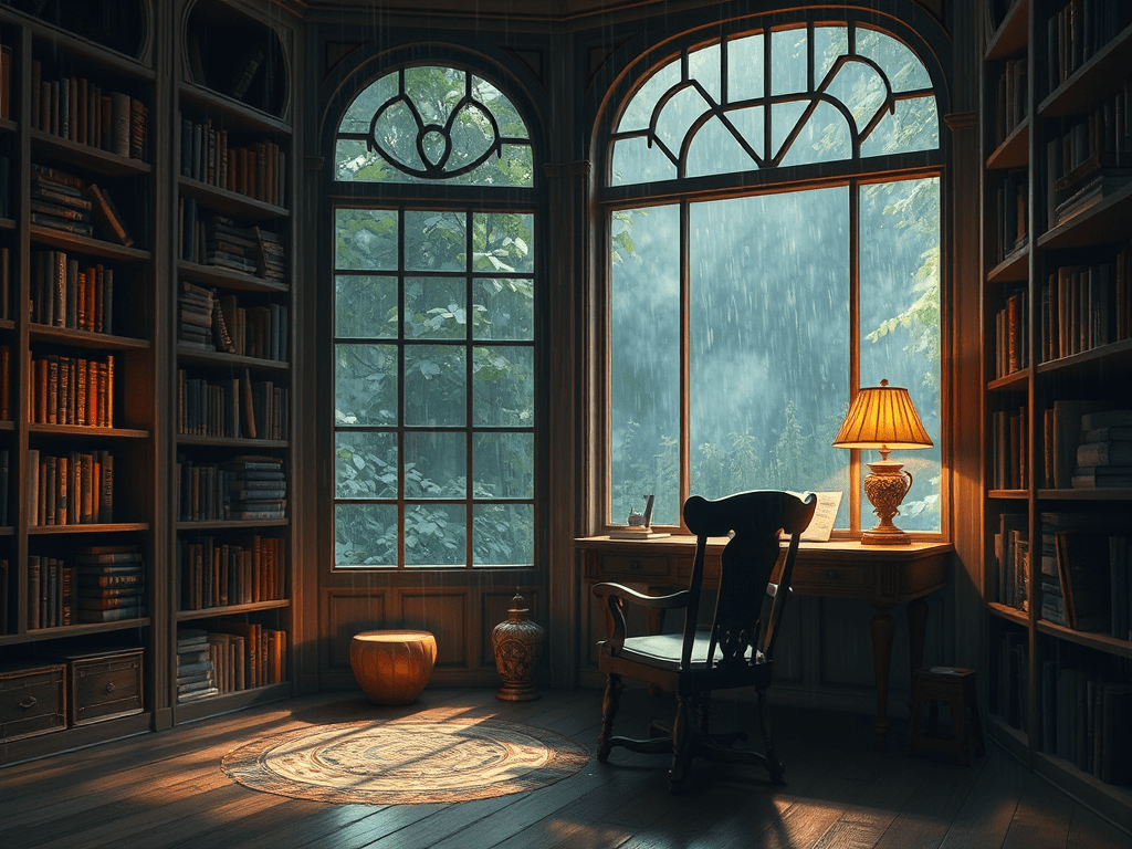 I imagine a chair and desk near a window surrounded by bookshelves with the pitter-patter of rain outside.