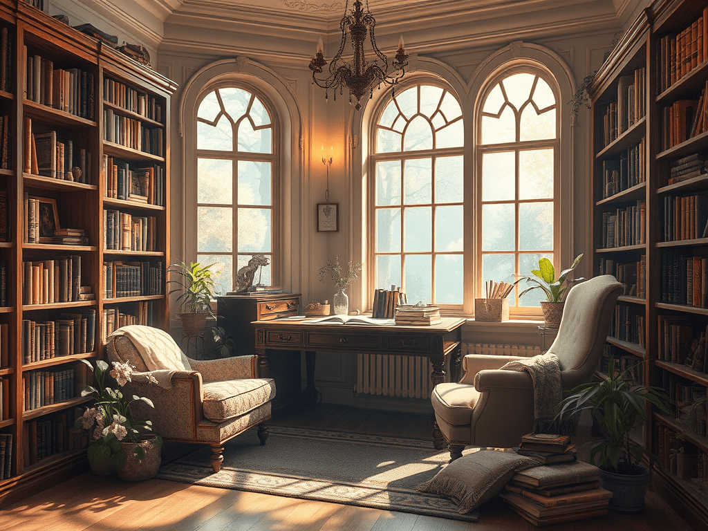 Three ornate windows which are rounded on top. My space allows silence without tension.